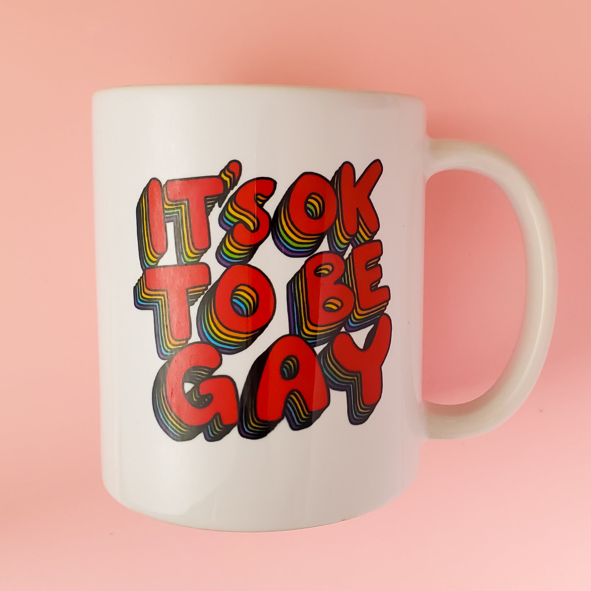 Start your morning off right with the positive affirmation of "It's OK to be gay" in rainbow colours on the side of this mug. This gay mug is an empowering addition to your coffee cup collection, so you can start your day on a positive note!