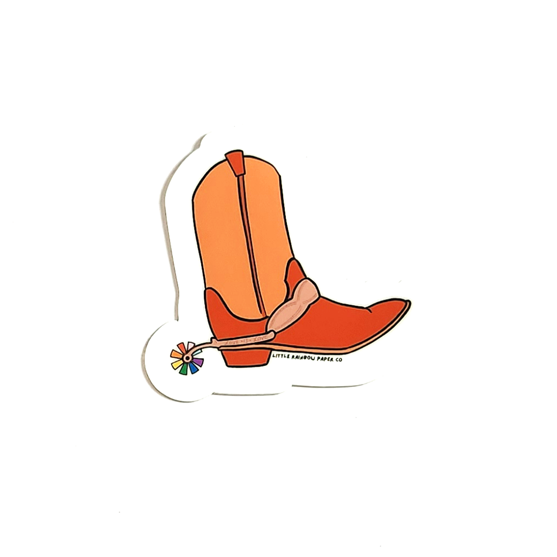 Saddle up and show your pride with our Pride Cowboy Boots sticker! This playful sticker boasts intricate details of a love is love message on the boot, accented by a colorful rainbow spur. A fun and unique way to express yourself and spread love!