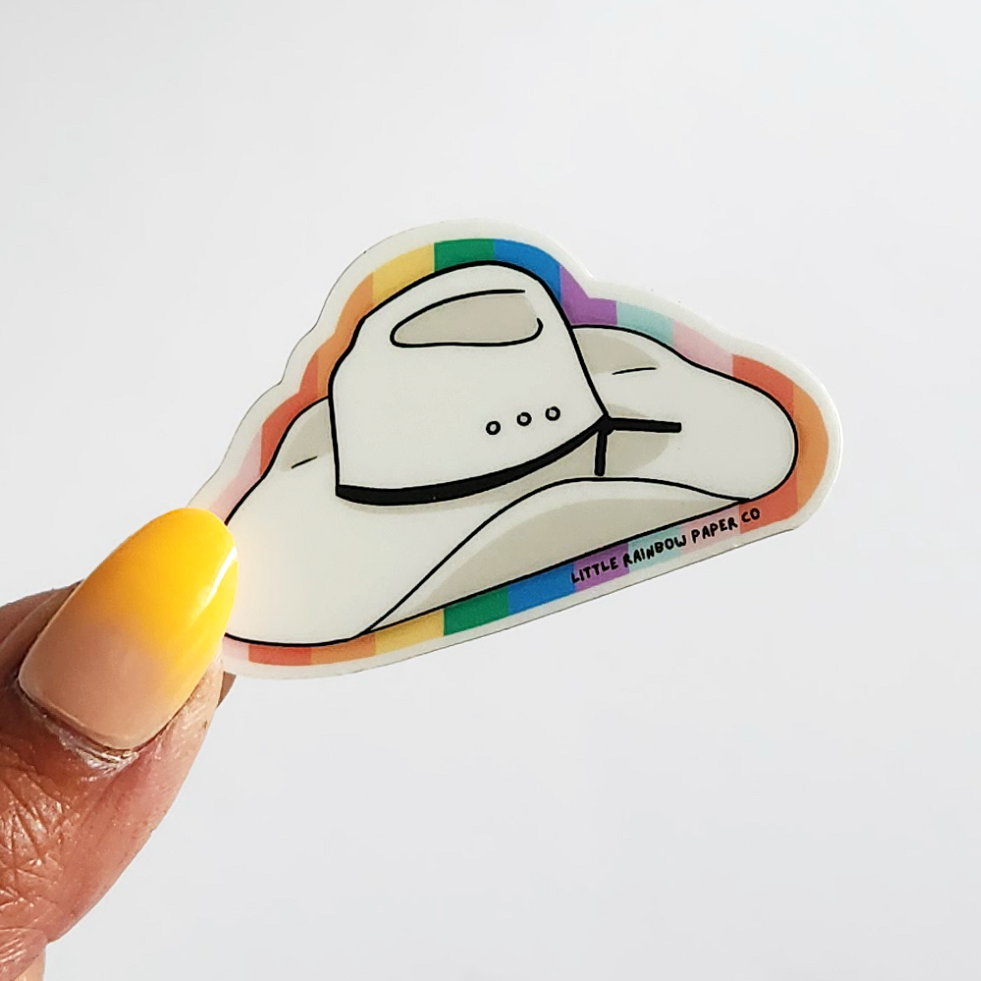 Spice up your gear with our playful Pride Cowboy Hat Sticker! Show off your pride and support for the LGBTQ community with this iconic white Calgary Stampede hat against a vibrant rainbow backdrop. Perfect for any festival, parade, or everyday wear. Yee-haw!