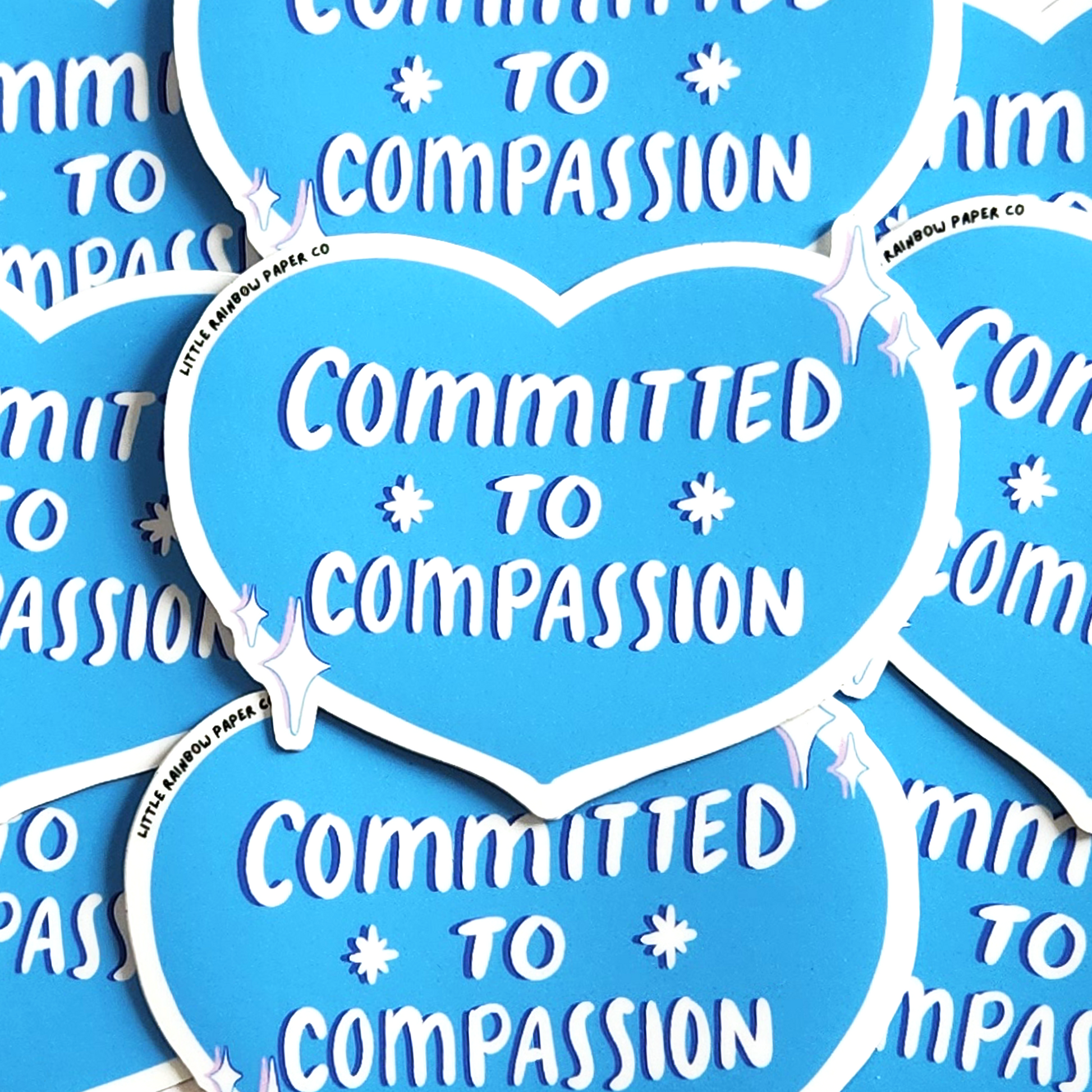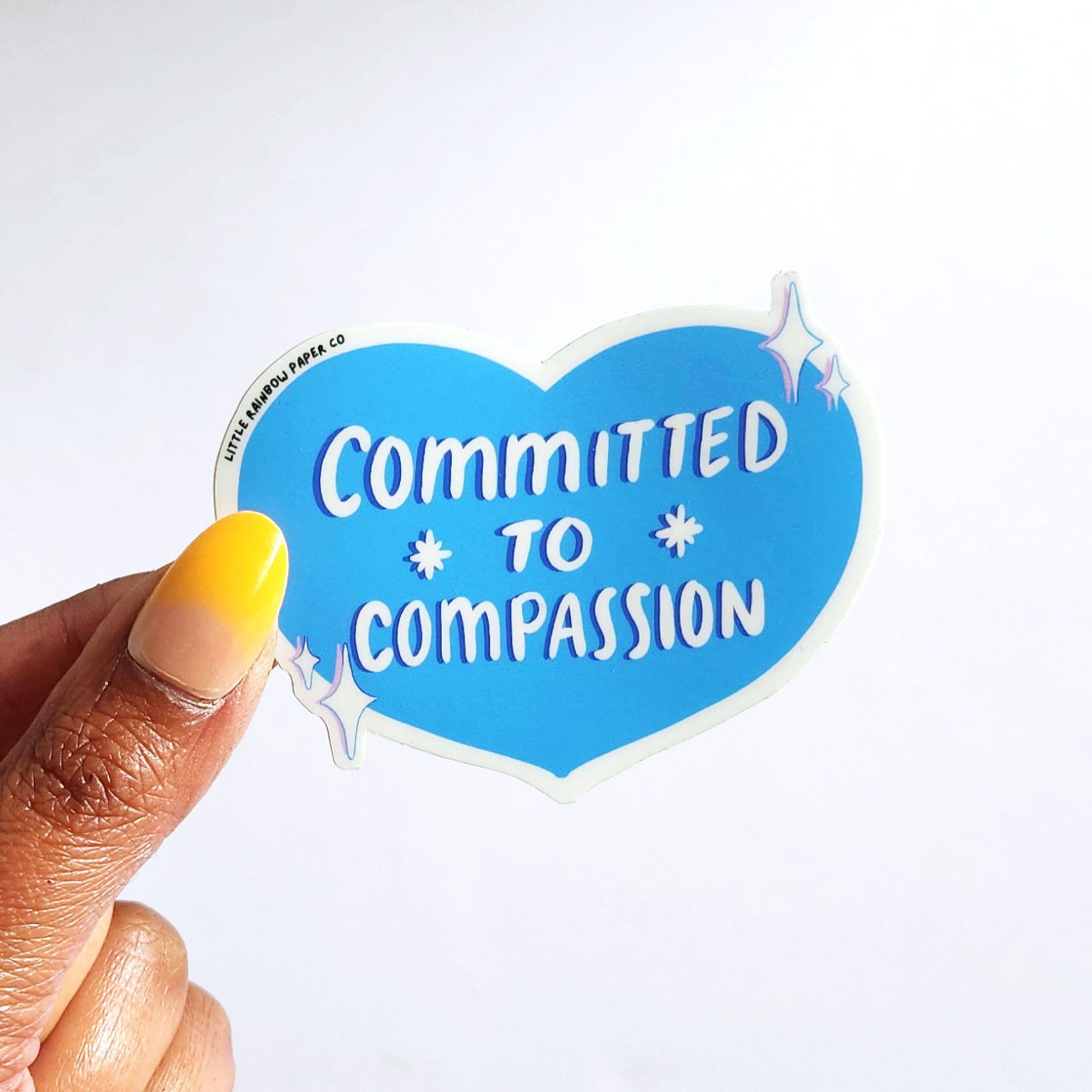 Wear your heart on your sleeve (or laptop, notebook, etc) with our Committed to Compassion sticker! With a blue heart and playful text, this sticker is a perfect reminder of your dedication to kindness and empathy. Stick it anywhere for a daily dose of compassion.