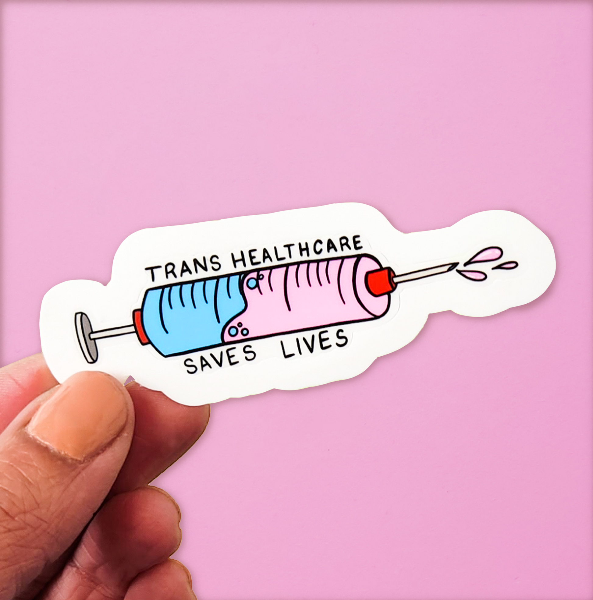 This cute sticker sends an important message that trans healthcare does indeed save lives. This will make the perfect addition to your water bottle, laptop or phone case.